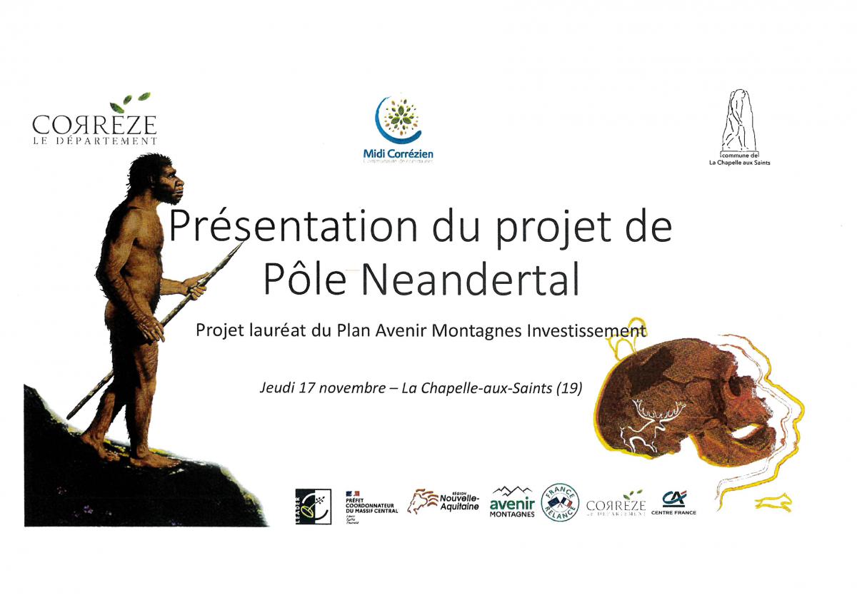 Dans le cadre du projet lauréat du Plan Avenir Montagnes Investissement, le projet Pôle Néandertal a été dévoilé à la Chapelle-aux-Saints en présence de nombreux élus et experts (Préfet, Sous-Préfet, Préfet de région, Conservateur du patrimoine DRAC Nouvelle Aquitaine, Président du Conseil Départemental de la Corrèze, Maire de la Chapelle-aux-Saints et son conseil municipal, Président de la Communauté de communes, élus du Midi Corrézien, architectes...).