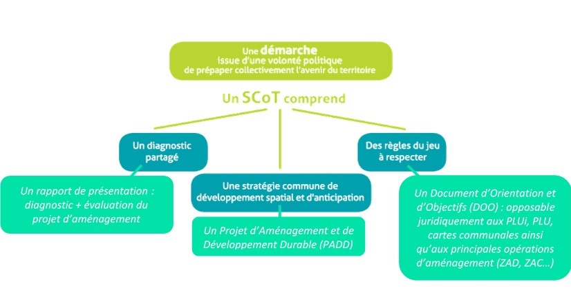 Le SCOT est destiné à servir de cadre de référence pour les différentes politiques sectorielles, notamment celles centrées sur les questions d’organisation de l’espace et d’urbanisme, d’habitat, de mobilité, d’aménagement commercial, d’environnement.... Il en assure la cohérence, tout comme il assure la cohérence des documents sectoriels intercommunaux : plans locaux d’urbanisme intercommunaux (PLUi), programmes locaux de l’habitat (PLH), plans de déplacements urbains (PDU), et des PLU ou des cartes communales établis au niveau communal.